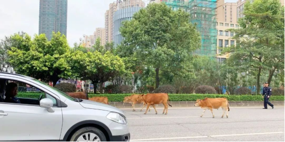 我局工作人员接报后随即赶到,看到“不守交通规则”的这六头牛正在路边绿化带停留,期间不断有意图横穿马路,我局工作人员尝试控制牛群。但这六头牛不听指挥,再次快速横穿马路到中间的绿化带,享受青草的“美味”。我局工作人员只能设法将牛群赶往路边和周边空旷的位置,远离城区大马路。随后我局工作人员与牛的主人取得联系,并要求其将牛群撤出城区范围。