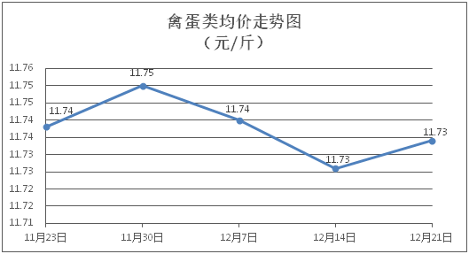 禽蛋类商品价格稳中略涨。所监测的禽蛋类商品价格波动情况为2涨3平,综合零售均价为每斤11.73元,环比上涨0.07%。其中:白条鸡、白条鸭零售均价分别为每斤20.93元、15.29元,环比分别上涨0.05%、上涨0.20%;鸡蛋、咸鸭蛋零售均价分别为每斤6.33元、8.93元,环比均持平。