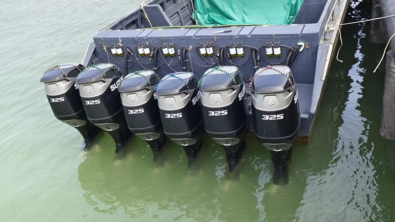 该艇具体特征如下:快艇为玻璃钢材质,艇体呈灰色,艇身未涂刷和悬挂船名船号,舷边由不锈钢包裹,船长14米,船宽3米,尾部装备6台汽油发动机,发动机外壳呈黑色,外壳用橡皮绷带固定,机体上印有“SUZUKI 325"字样。