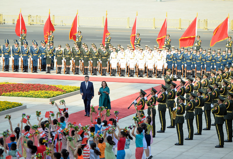 6月28日下午,国家主席习近平在北京人民大会堂同来华进行国事访问的秘鲁总统博鲁阿尔特举行会谈。这是会谈前,习近平在人民大会堂东门外广场为博鲁阿尔特举行欢迎仪式。图片来源:新华网