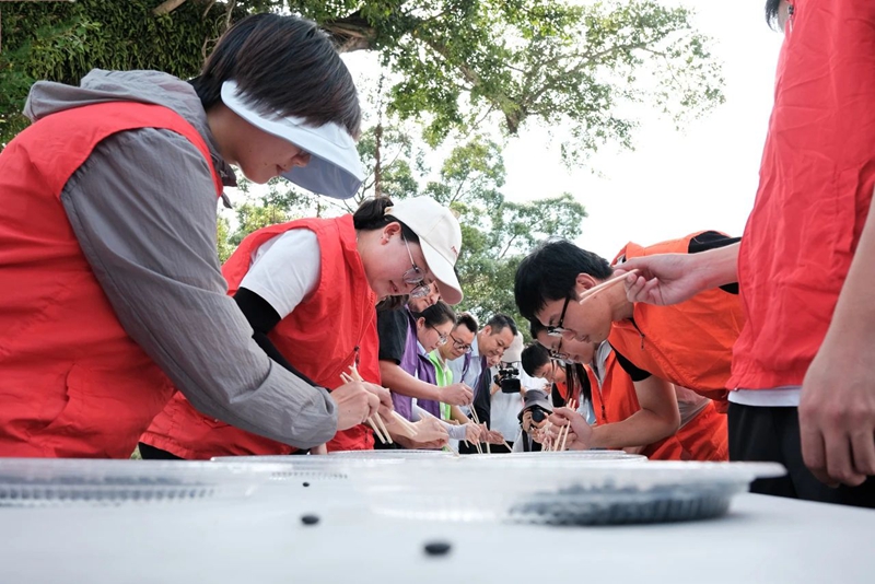 为了增加比赛的趣味性和农耕文化的体验感,运动会设置了拣豆子、抛秧、拔河、二人三足4个充满农趣的比赛项目。在拣豆子比赛中,参赛者需要用筷子将碗中的黑豆挑拣出来,并快速准确地传递到下一个队员的碗中。这一项目不仅考验了参赛者的眼力、手力和定力,还让大家在紧张刺激的比赛中感受到了农耕文化的魅力。获得“拣豆子”项目第一名的西墩村村民黄春燕兴奋地说:“最考验专注力的就数捡豆子比赛了,我在比赛中尽量保持冷静,手才能更加稳。”