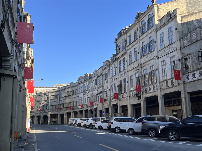 放眼望去,道路两侧外立面的五星红旗鲜艳夺目。一面面鲜艳的五星红旗整齐划一,与蓝天白云交相呼应,呈现出一道靓丽的风景线,不时有群众驻足并拿起手机拍照留念。