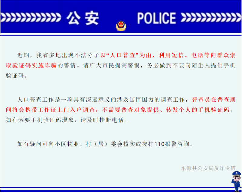 人口普查工作是一项具有深远意义的涉及国情国力的调查工作,正规的普查员在工作期间必须佩戴人口普查机构统一颁发的工作证,穿工作服上门普查,不需要普查对象提供、转发个人的手机验证码,如有索要手机验证码,请及时挂断电话;