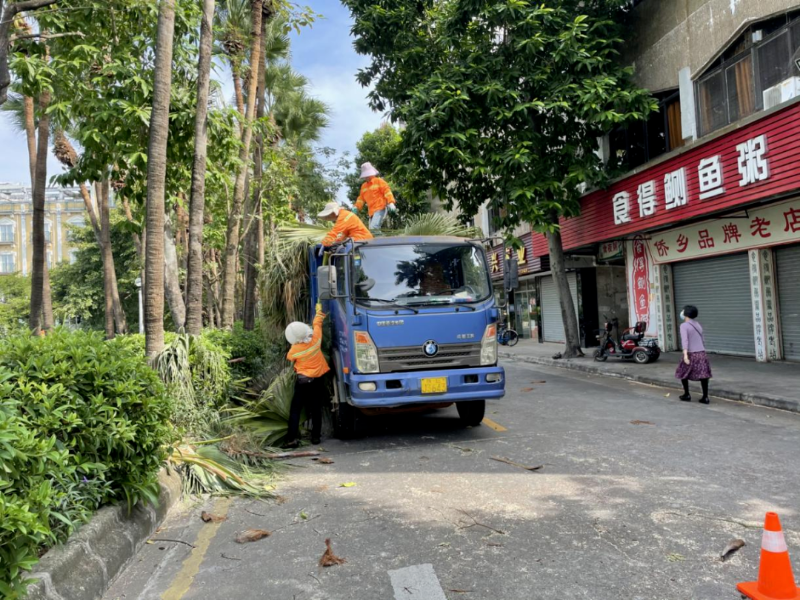 园林管理处出动360人次,清理了舜德路、凤凰大道等主干道及宁城公园、五福公园等路段的大王椰、蒲葵等逾800棵树身上的枯枝叶,并清理了陈宜禧路、环市路等主干道及公园绿地的卫生死角,清运垃圾30多车次。