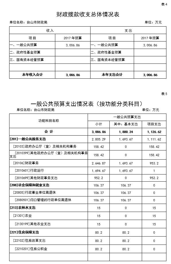 (一)本部门预算为汇总预算,包括:台山市财政局本级预算,以及纳入编制范围的下属单位预算。下属单位具体包括:台山市政府投融资和债务工作办公室,台山市财政投资审核中心,台山市财政国库支付中心。