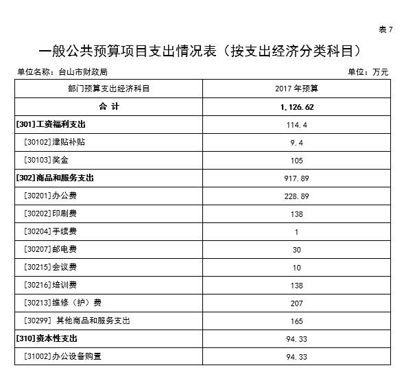 (二)台山市财政局内设机构有:办公室、法规税政股、预算股、国库股、行政事业资产管理股、综合规划股、行政政法股、教科文股、工贸发展股、农业股、经济建设股、社会保障股、外经金融股、会计股、绩效评价股、财务总监办公室、监督检查股、政府采购管理股、人事教育股十九个职能股室。