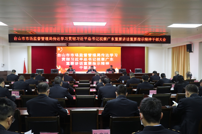 4月25日上午,市市场监管局召开干部大会,传达学习贯彻习近平总书记视察广东重要讲话重要指示精神,动员全局上下坚定不移沿着总书记指引的方向勇毅前行,奋力交出高质量发展走在前列的优异答卷。局机关全体干部、各市监所所长近100人参加会议。