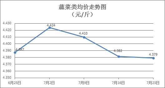 蔬菜类商品价格升降互现。上周所监测的32 种蔬菜商品价格波动情况为13涨18跌1平,综合零售均价为4.379元/斤,环比下降0.06%。其中:涨幅居前的品种包括菠菜、青尖椒、本地菜心,零售均价分别为每斤5.90元、4.73元、4.77元,环比分别上涨3.87%、3.05%、2.58%;跌幅居前的品种包括莲藕、丝瓜、白苋菜,零售均价分别为每斤5.30元、3.67元、4.00元,环比分别下降3.64%、3.17%、2.91%。