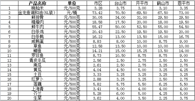 说明:1、表中价格为该地区监测点综合平均价;2、“市区”含蓬江区、江海区、新会区,价格分别采自蓬江市场、江南市场、城东市场等13家农贸市场;3、其他四个县市价格分别采自新华市场、锦江市场等8家农贸市场。