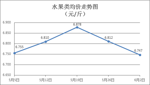 水果类商品价格总体略降。所监测的6种水果商品价格波动情况为3涨3跌,综合零售均价为每斤6.747元,环比下降0.95%。其中橙子、梨、葡萄零售均价分别为每斤5.67元、6.09元、14.93元,环比分别上涨0.53%、下降0.49%、下降2.93%。