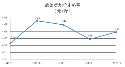 蔬菜类商品价格总体略涨。所监测的32 种蔬菜商品价格波动情况为17涨14跌1平,综合零售均价为每斤4.61元,环比上涨0.22%。其中:涨幅居前的品种包括花菜、蒜苔、西红柿,零售均价分别为每斤5.18元、8.51元、4.13元,环比分别上涨3.81%、3.03%、2.99%;跌幅靠前的品种包括白苋菜、青豆角、苦瓜,零售均价分别为每斤4.08元、5.00元、4.55元,环比分别下降5.77%、2.72%、2.15%。