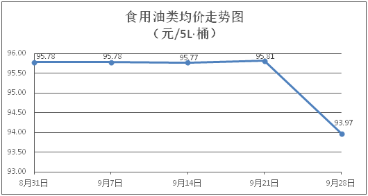 食用油类商品价格小幅下降。所监测的9种食用油(5L装)商品价格波动情况为3涨6跌,综合零售均价为每桶93.97元,环比下降1.92%。其中:鲁花花生油、菜籽油零售均价分别为每桶156.63元、72.09元,环比分别上涨0.09%、下降1.96%。