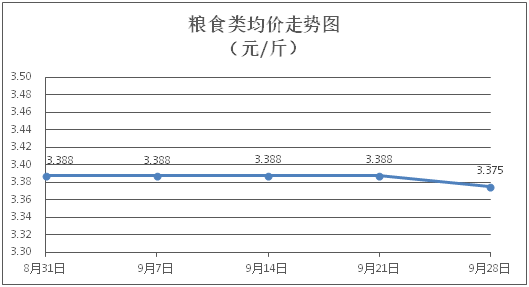 粮食类商品价格稳中有降。所监测的4种粮食类商品价格波动情况为2跌2平,综合零售均价为每斤3.375元,环比下降0.37%。其中:丝苗米、面粉零售均价分别为每斤3.51元、3.35元,环比分别持平、下降1.18%。