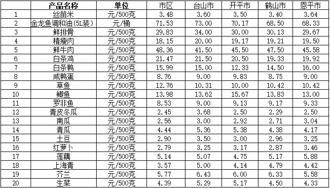 说明:1、表中价格为该地区监测点上周综合平均价;2、“市区”含蓬江区、江海区、新会区,价格分别采自蓬江市场、江南市场、城东市场等13家农贸市场;3、其他四个县市价格分别采自新华市场、锦江市场等8家农贸市场。