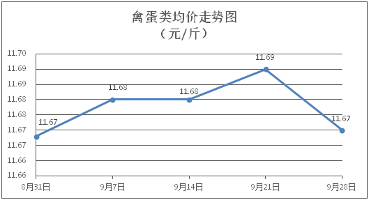 禽蛋类商品价格窄幅盘整。所监测的5种禽蛋类商品价格波动情况为2涨3跌,综合零售均价为每斤11.67元,环比下降0.17%。其中:白条鸡、白条鸭零售均价分别为每斤20.81元、15.12元,环比分别上涨0.05%、下降0.13%;鸡蛋、鸭蛋零售均价分别为每斤6.40元、7.04元,环比分别上涨0.31%、下降0.71%。