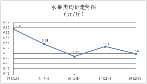 水果类商品价格升降互现。所监测的6种水果商品价格波动情况为3涨3跌,综合零售均价为每斤6.50元,环比下降0.43%。其中橙子、香蕉、梨零售均价分别为每斤7.53元、2.95元、5.32元,环比分别上涨2.03%、下降1.99%、上涨0.19%。