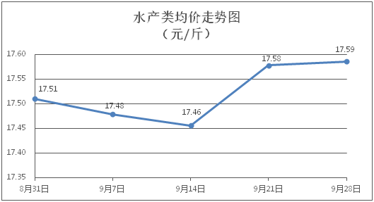 水产类商品价格小幅波动。所监测的9种水产商品价格波动情况为3涨6跌,综合均价为每斤17.59元,环比上涨0.04%。其中:黄花鱼、鲫鱼、鳙鱼、基围虾零售均价分别为每斤26.58元、14.01元、10.88元、29.13元,环比分别上涨2.59%、下降0.36%、下降1.89%、上涨0.73%。