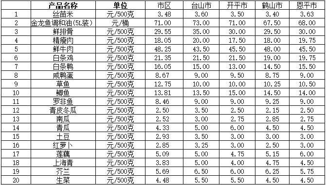 说明:1、表中价格为该地区监测点综合平均价;2、“市区”含蓬江区、江海区、新会区,价格分别采自蓬江市场、江南市场、城东市场等13家农贸市场;3、其他四个县市价格分别采自新华市场、锦江市场等8家农贸市场。