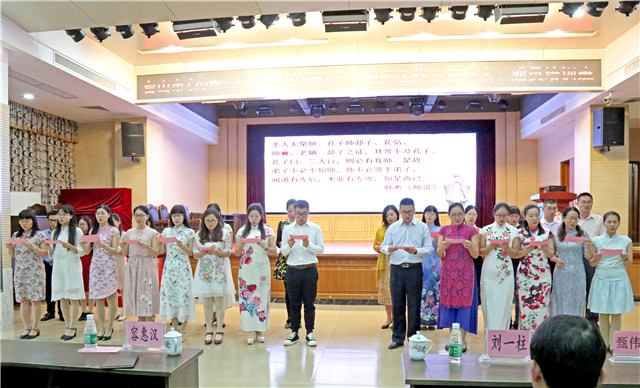 15日早上8时40分,开班仪式正式开始。容惠汉在讲话中对新一轮工作室的组建和运营提出了新的要求,希望工作室每一位人员都能主动提升和发展自己,不负重托,不辱使命。接着全体人员回顾了授牌仪式,43个工作室的人员重温了第一次见面的喜悦场景,再次点燃重新出发的责任心和使命感。最后,在语文工作室领读下,会场响起诵读经典的朗朗之声,彰显了台山教育人向着教育高峰进发的信心和愿望。