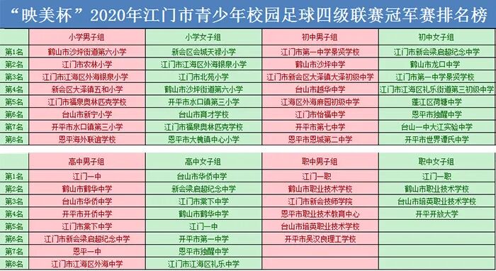 10月22日至25日,由江门市教育局、江门市文化广电旅游体育局主办,台山市教育局、台山市文化广电旅游体育局承办的“映美杯”2020年江门市青少年校园足球四级联赛冠军赛在台山举行。来自三区四市和江门市直学校43所学校58支队伍共934名运动员参赛。