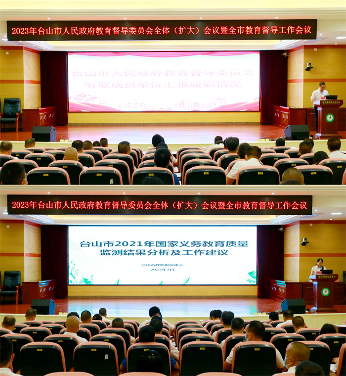 近日,台山市人民政府教育督导委员会全体(扩大)会议暨全市教育督导工作会议在市教师发展中心会召开,会议传达学习了国家、省、市深化新时代教育督导体制机制改革文件精神,总结前期教育督导工作的新进展、新成效,研究部署今后一段时期全市教育督导工作。市有关领导出席会议并讲话。市教育局主要负责人在会上作工作汇报,市委编办、市财政局等部门先后汇报2022年度履行教育职责情况。市教师发展中心分学科解读2021年国家义务教育质量监测结果。