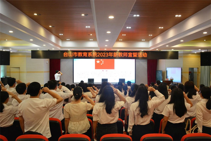 10月27日,2023年台山市教育系统新教师师德建设会暨新教师入职宣誓仪式在台山市东晖小学举行,市教育局党组成员、副局长黄国盼,有关股室负责同志,2023年台山市教育系统新入职教师140多人参加。