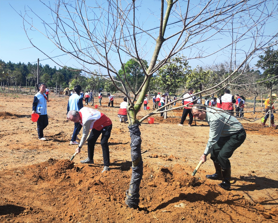 携着泥土芬芳的春风扑面而来,植树人员扛起铁锹,大步走向植树点。铲泥入坑、挥锹培土、扶树正苗、提水浇灌……接连种下紫花风铃木、澳洲火焰木、红枫、芙蓉木、黄花腊肠树、无忧树、四季茶花等苗木,为台山市红岭种子园增添一片新绿。在和煦的春风中,新栽下的苗木昂然挺立,孕育着勃勃生机,焕发出绿色希望。