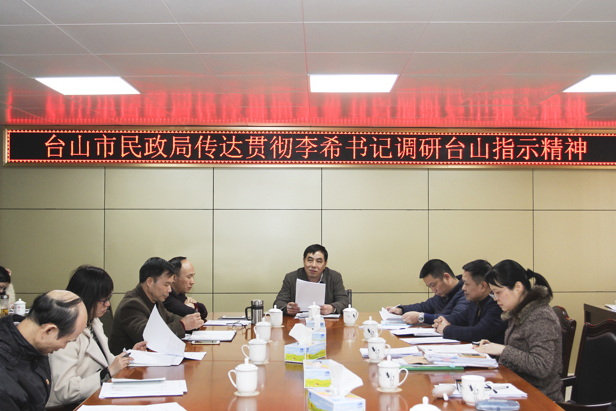 1月16日下午,台山市民政局召开党组(扩大)会议,传达学习贯彻省委书记李希调研台山的指示精神。局党组书记、局长林杰荣在会上传达了1月15日召开的市委常委会(扩大)会议精神,提出了落实省委书记李希在台山调研指示精神的贯彻实施意见。局机关全体公务员及下属各单位负责同志参加会议。