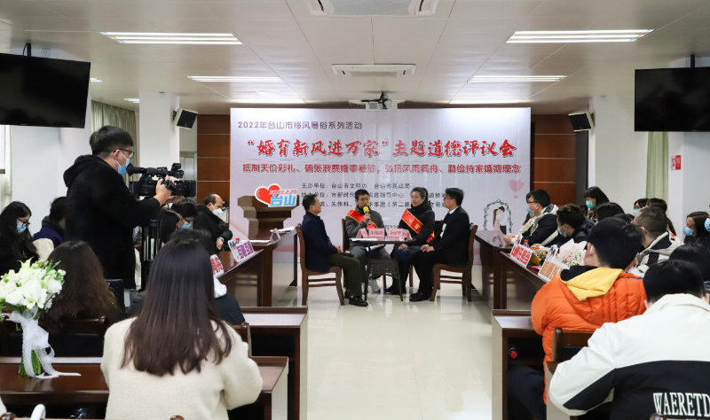 为抵制天价彩礼、铺张浪费婚事陋俗,弘扬风雨同舟、勤俭持家婚姻理念,倡导婚事简办的婚俗文化,树立文明健康的婚俗观,2月22日上午,由台山市文明办、台山市民政局主办、台山市新时代文明实践指导中心和桥湖社区协办的2022年台山市移风易俗之“婚育新风进万家”主题道德评议会在市民政局进行,主办方代表及当天登记的新人代表约50人参加活动。