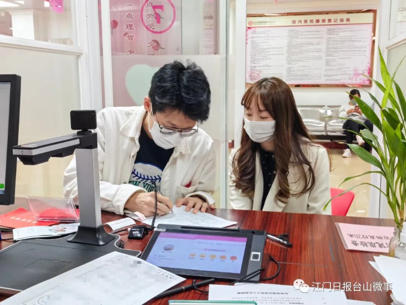 台山市民政局婚姻登记处相关工作人员介绍,面对扎堆的人潮,台山市民政局婚姻登记处迅速响应,增派人手和增开办证窗口,做好分流疏导工作,全力满足新人的婚姻登记需求。