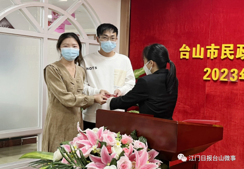 值得关注的是,在情人节这一天,为了让领证的环节更具有仪式感,台山市民政局特意在今天增设了宣誓和颁证环节,颁证员为新人颁发结婚证,为新人送上最真挚的祝福。