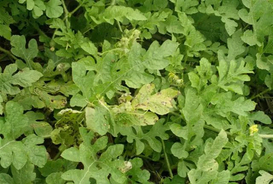识别要点:①叶片,病斑大、半圆形或“V”形、有轮纹;②茎蔓,开裂、流胶