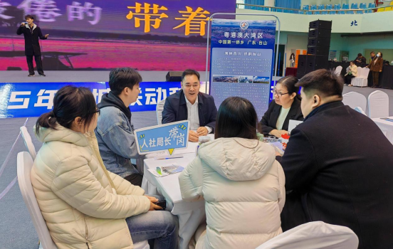 活动现场特设“BOSS直聘区”“人社局长带岗区”及“博士面对面区”三大特色专区。在“人社局长带岗区”,台山市人社局局长赵湖滨、副局长肖雄英现场为毕业生学子推介城市以及讲解人才政策,为人才与企业搭建一座高效对接的“直通桥”。