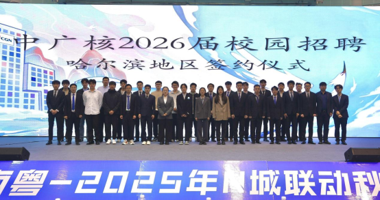 在招聘会现场上,台山亮点异彩纷呈,启动仪式上哈工大校友,台山核电党委书记、董事长刘丹作为战略性新兴产业领军企业代表发言,深情分享了自己在广东的奋斗历程,向母校学子传递来自大湾区的机遇与诚意。据统计,中广核集团在哈尔滨地区高校与103名毕业生达成就业意向,其中博士3人,硕士65人,在活动当天,与25名哈工大毕业生举办现场签约仪式,派发录取通知书。金桥铝材、精诚达也分别与高校学子达成就业意向并现场签约,人社部门为签约学子送上就业礼包。