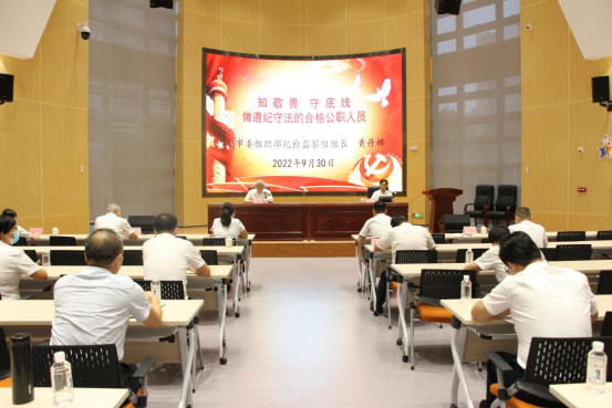 9月30日,市人社局在大广海湾青创智谷召开廉政教育及近期工作部署会议,市纪委监委驻市委组织部纪检监察组组长黄丹娜、市人社局党组班子成员以及局机关、社保、人才办、就业中心、仲裁院副股以上干部和市技校班子成员共50多人参会。