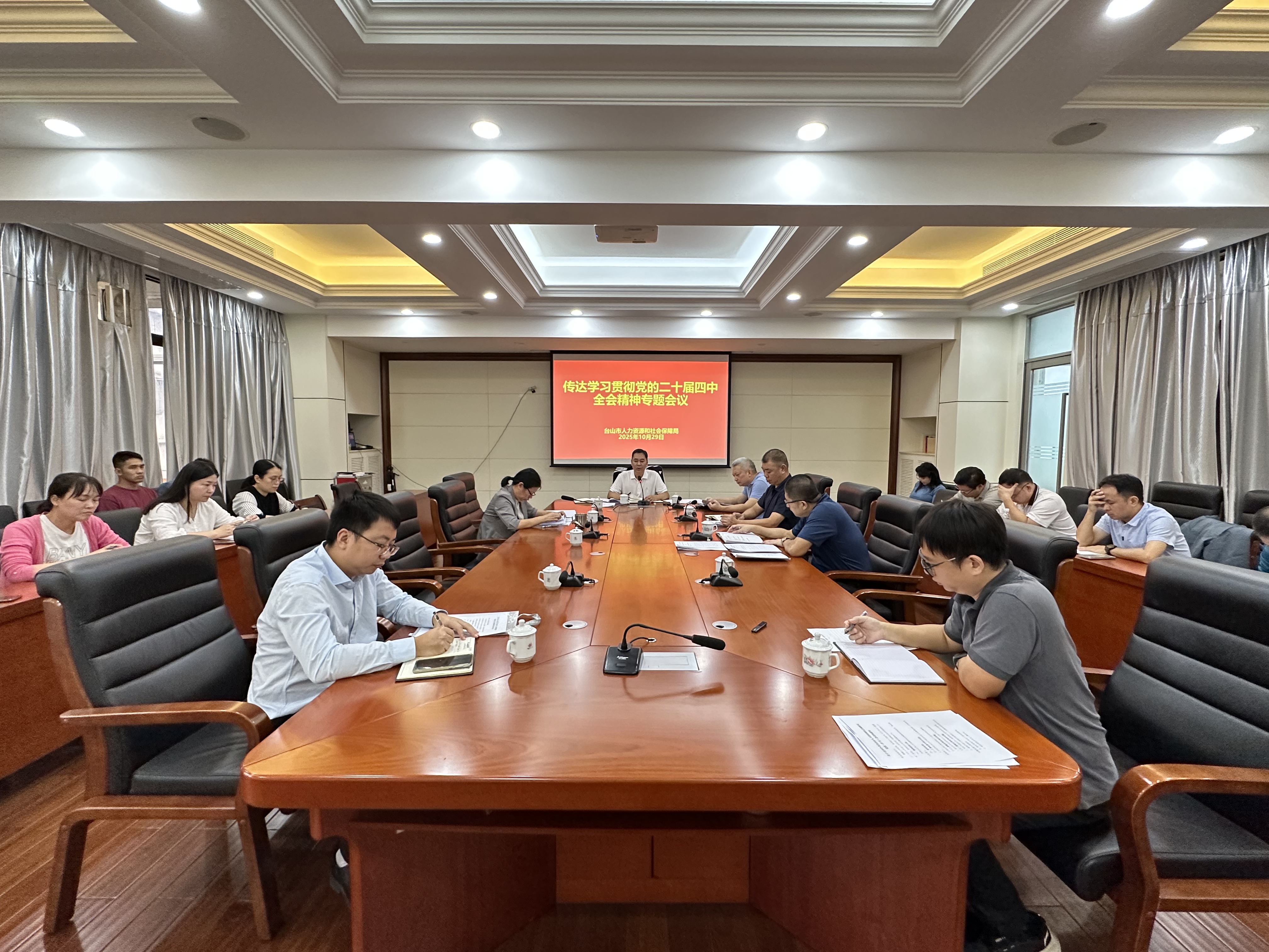 10月29日,市人社局召开党组(扩大)会议,专题学习党的二十届四中全会部署和习近平总书记重要讲话精神,传达省、江门和台山有关会议精神,对抓好贯彻落实提出具体要求。局党组书记、局长赵湖滨主持会议并讲话,局党组成员、各股室及下属单位负责人参加会议。