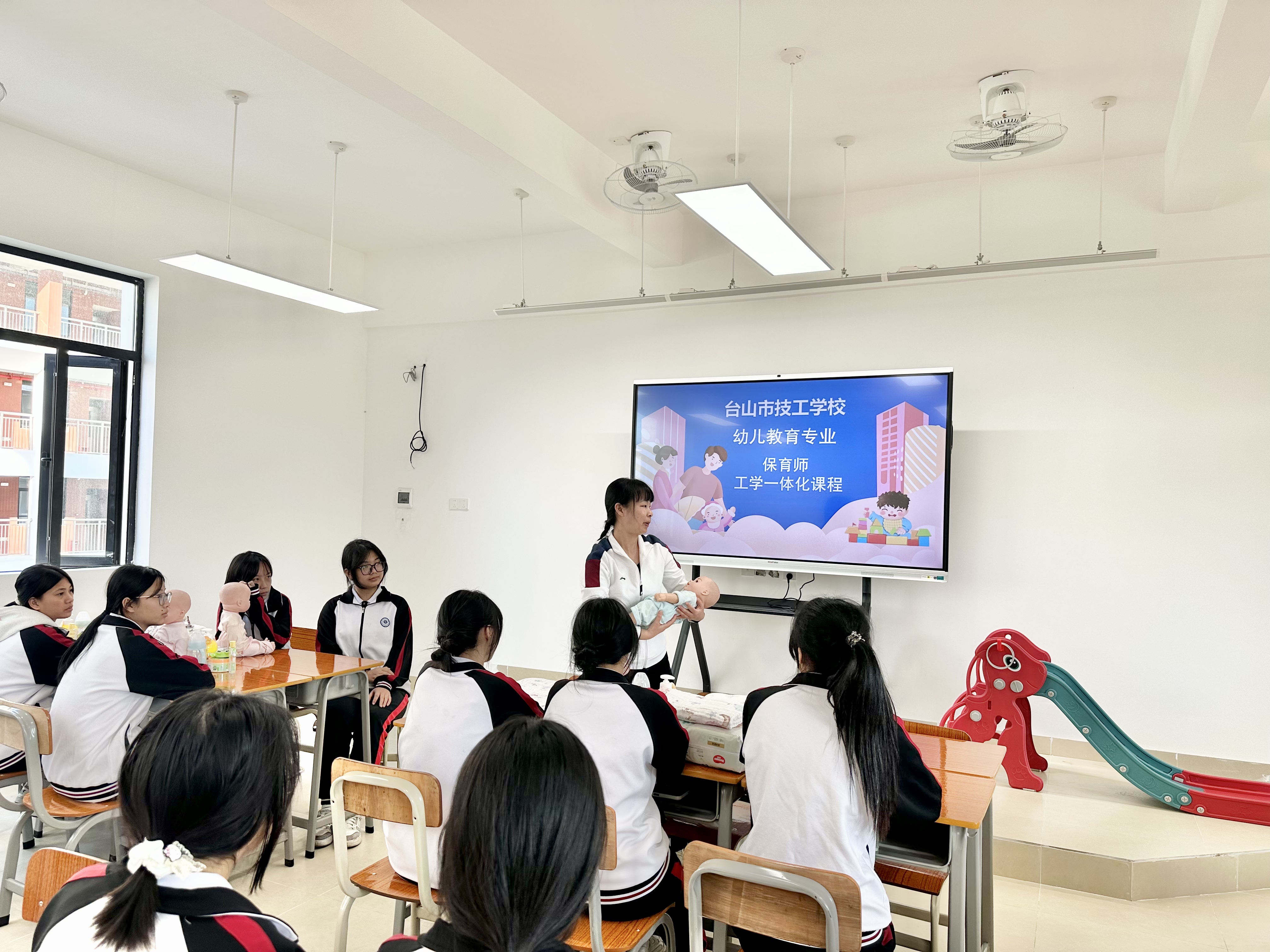 与此同时,幼儿教育专业的保育员工学一体化课在全新教室精彩开讲,师生依托先进教学条件,将理论知识与实操技能深度融合,沉浸式体验“做中学、学中做”的教学模式,让职业教育的独特魅力充分彰显。