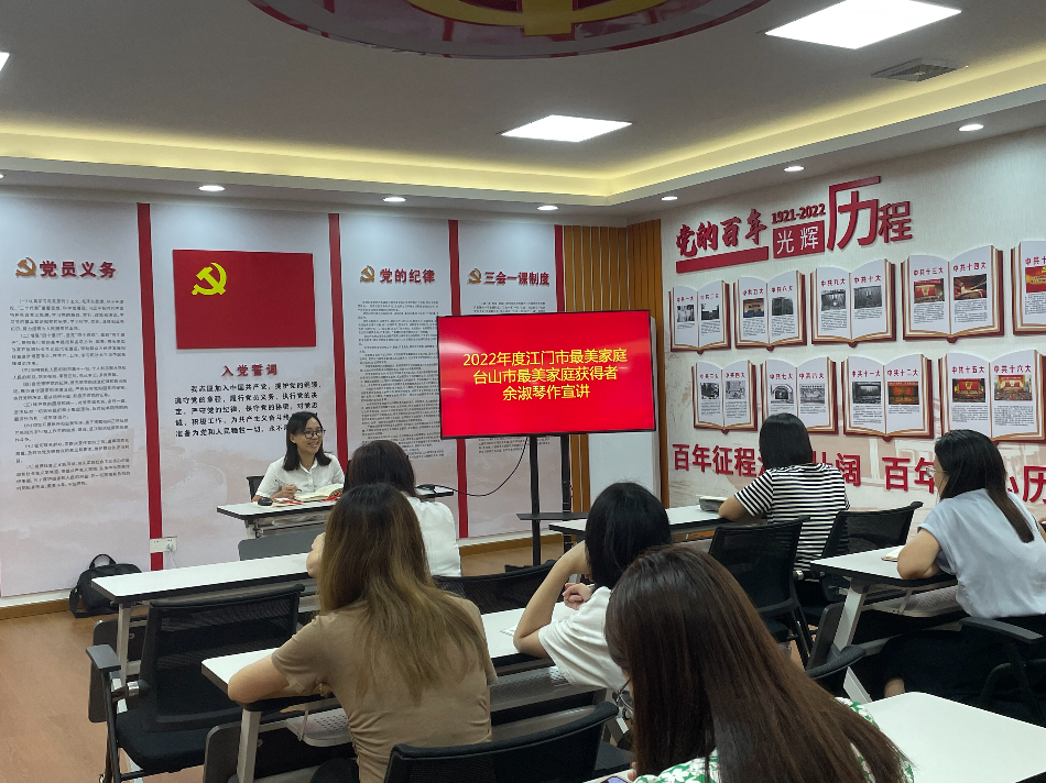 习近平总书记问生计冷暖、察民情民愿、讲惠民政策的感人故事。接着,2022年度江门市“最美家庭”、台山市“最美家庭”获得者余淑琴同志作先进事迹报告,用生活中的点点滴滴诠释家与爱的真谛,并分享如何处理婆媳关系、夫妻关系以及子女教育等经验。随后,局公法股股长关毅辉同志简要介绍其儿子的学习经历和取得的优异成绩,就如何教育子女问题,分享自己的经验和心得。