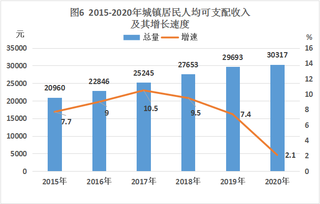 全年城镇居民人均可支配收入30317元,比上年增长2.1%。