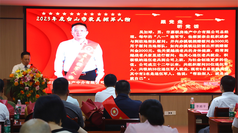 “我从小就非常敬佩和崇拜军人,所以创业以后,我就想着能为他们做点什么。”台山市嘉联地产总经理吴加球作为“最美拥军人物”代表发言。据悉。嘉联地产目前已帮助38位退伍军人再就业,每年的“八一”节,都会主动慰问驻军部队官兵和困难退役军人,为退伍老兵解决实际困难。
