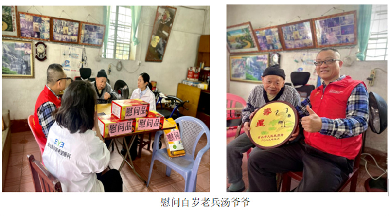 台山市退役军人服务中心联合台山爱尔新希望眼科医院上门走访慰问百岁老兵汤爷爷,为他提供眼部健康检查和咨询。据了解,汤爷爷出生于1922年,今年已届102岁高龄,曾因军事练兵表现突出,被评为学习模范。虽已过百岁,但追忆往昔,依旧目光如炬,跟工作人员讲起那段峥嵘岁月更是滔滔不绝。从老兵的讲述中,依然能够感受老兵的拳拳爱国之心。在场工作人员由衷地产生崇高的敬意,感谢汤爷爷为保卫和建设祖国作出的贡献,并送上节日慰问品,叮嘱他保重身体、安享晚年。