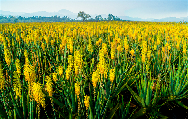 庄园种植芦荟面积达1000多亩,约200多万株芦荟,种植品种为美国德州直接进口的库拉索芦荟,基地已获得欧盟EC、美国NOP和中国有机三种认证,以及中国原厂地生态保护。庄园里不同区块的芦荟处于不同生长期,因此可观赏到不同形态的芦荟。春节前后,芦荟陆续开花,形成一片黄色花海,非常壮观美丽。