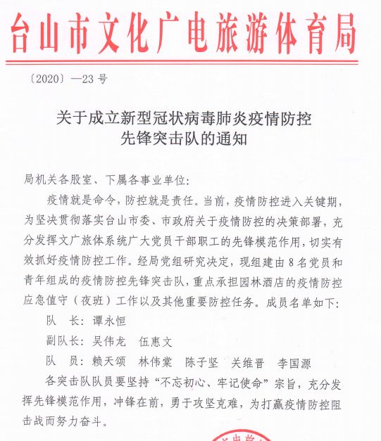 庚子新春,新冠肺炎疫情牵动国人之心。在市委、市政府的正确领导下,台山市文广旅体局党组始终坚持“疫情就是命令,防控就是责任”要求,积极发挥共产党员的先锋模范作用,文旅体领域涌现出了黄超峰、袁昕华、陈健忠等一批先进个人,他们不畏艰险,勇于奔赴工作一线,为全市防控工作做出了应有贡献。
