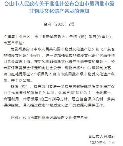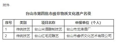 日前,我市政府网发布了台山市第四批市级非物质文化遗产名录,他们分别是台山米酒酿制技艺、台山红毛泥雕艺!
