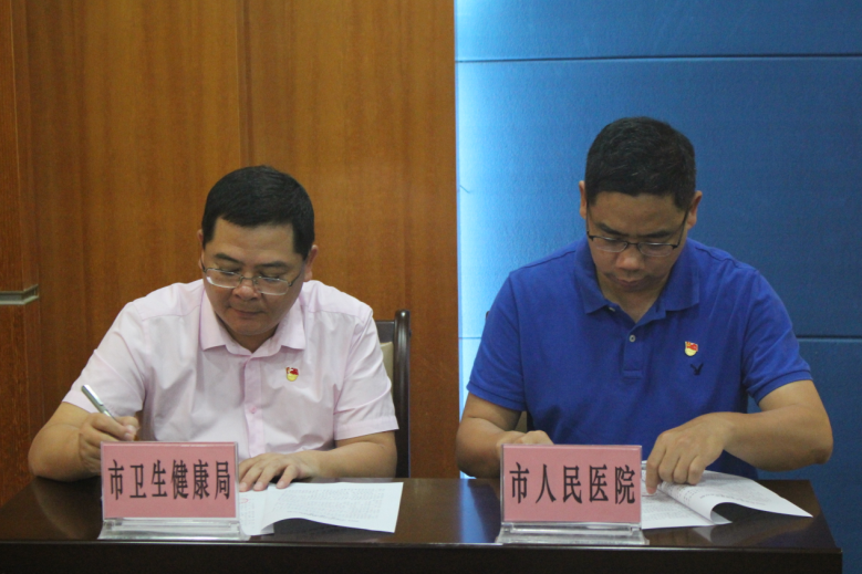 图为伍虹灯同志代表局党组与市人民医院签订党风廉政建设责任书