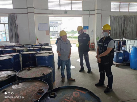 图为:5月1日检查组一行对台山市鑫华化工有限公司进行现场督查