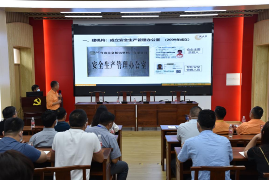 接着,台山市金桥铝型材厂有限公司副总经理吴作慢从本公司的组织架构、安全生产各项制度、培训教育、应急演练等方面向各位学员分享了安全生产管理经验,并带领各位学员参观了生产车间。