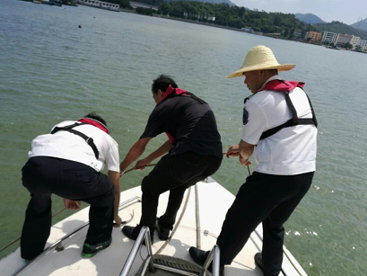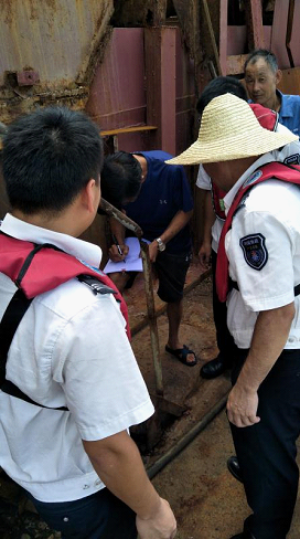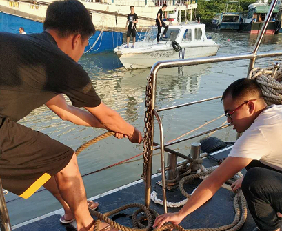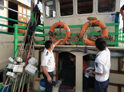 (渔政人员上船检查检查渔船受损及安全设备配备情况)