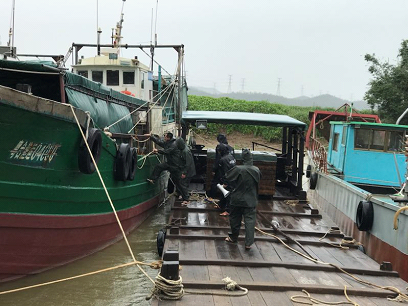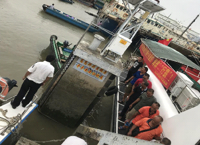 (渔政人员在横山渔港接驳渔船从业人员上岸避风)