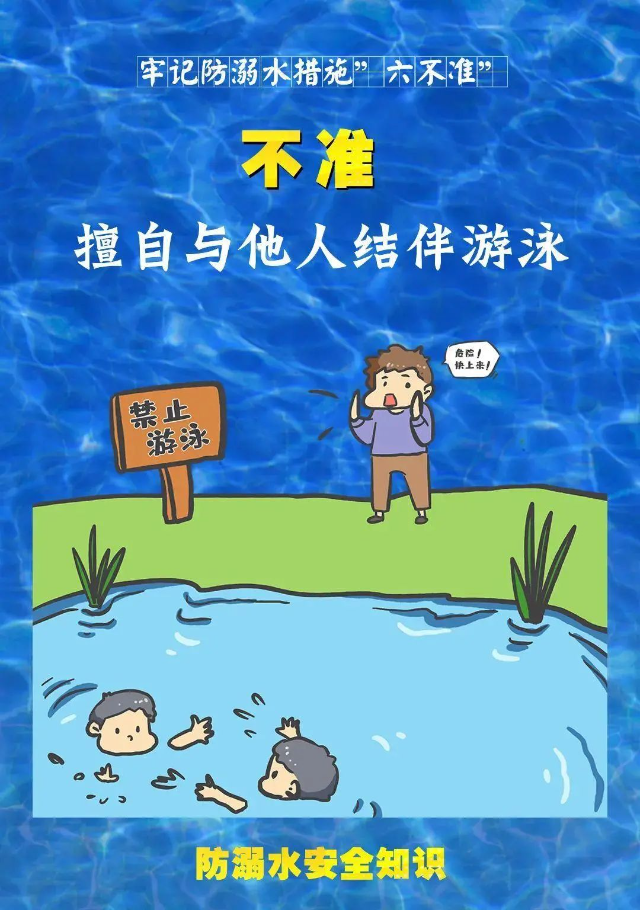安全教育则关乎孩子的生命安全。请各家长朋友们加强对孩子预防溺水的安全教育, 提高孩子的自我保护意识,使孩子严格遵守防溺水“六不”教育,即:不私自下水游泳;不擅自与他人结伴游泳;不在无家长或老师带领的情况下下水游泳;不到无安全设施、无救援人员、无安全保障的水域游泳;不到不熟悉的水域游泳;不熟悉水性的未成年人不擅自下水施救。